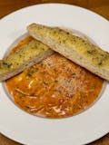 Tortellacci pasta filled with shrimp and lobster in aurora (red and white) sauce, finished with Parmesan cheese, served with garlic bread.